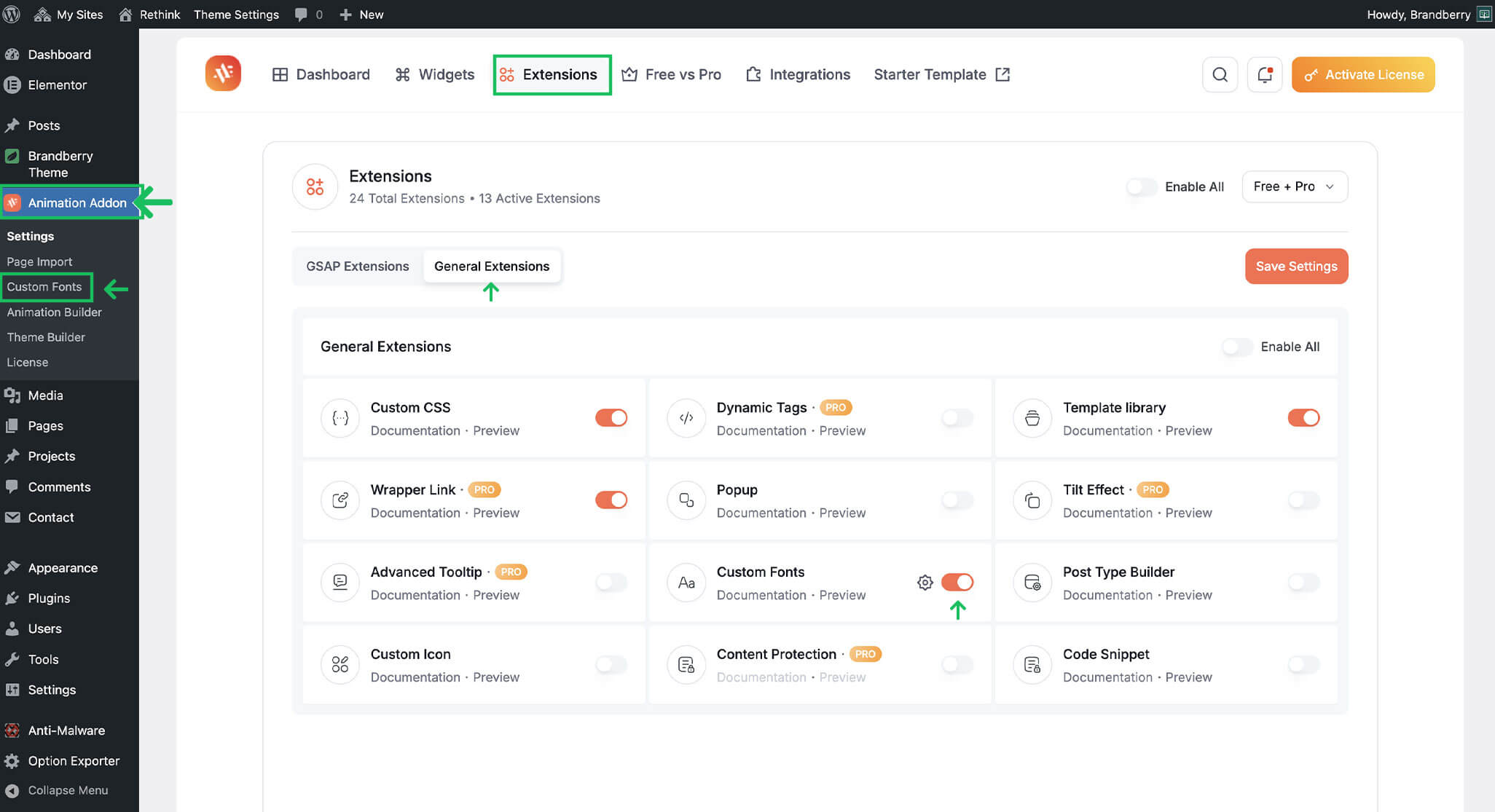 Brandberry fully supports custom fonts added through Animation Addons. You can combine custom fonts with Elementor’s global typography for consistent styling across your site.