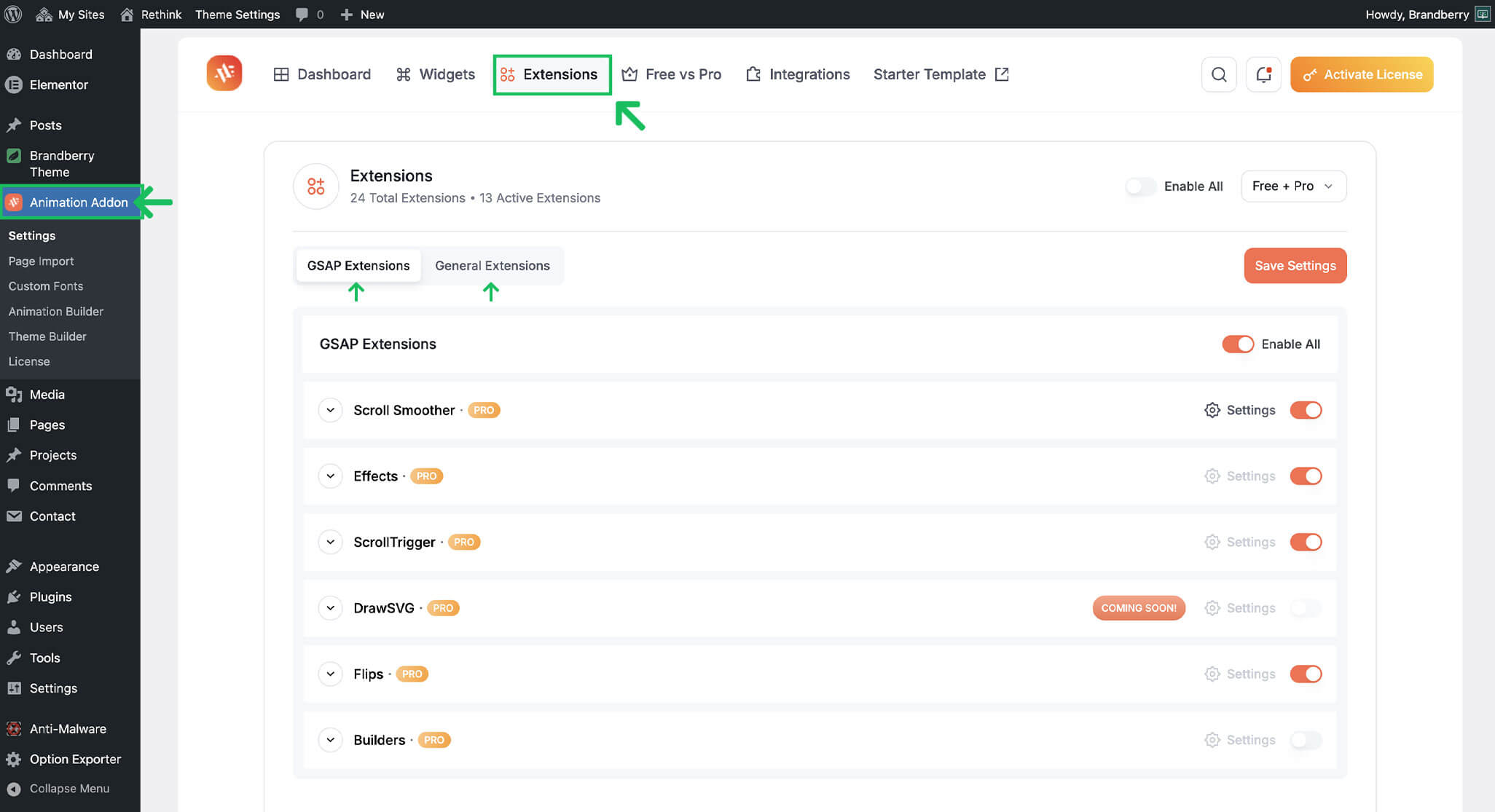 Brandberry uses several Animation Addons extensions to enable features like popups, custom CSS, template libraries, and advanced interaction effects.
