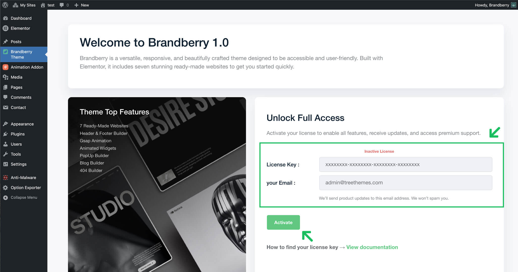 After installing and activating the Brandberry theme, you will be prompted to activate your theme license. A license activation screen will appear in your WordPress dashboard.