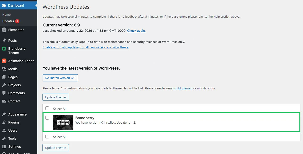 Keeping Brandberry up to date is essential for performance, security, and compatibility with the latest WordPress versions. This section explains how to update the theme safely and correctly.