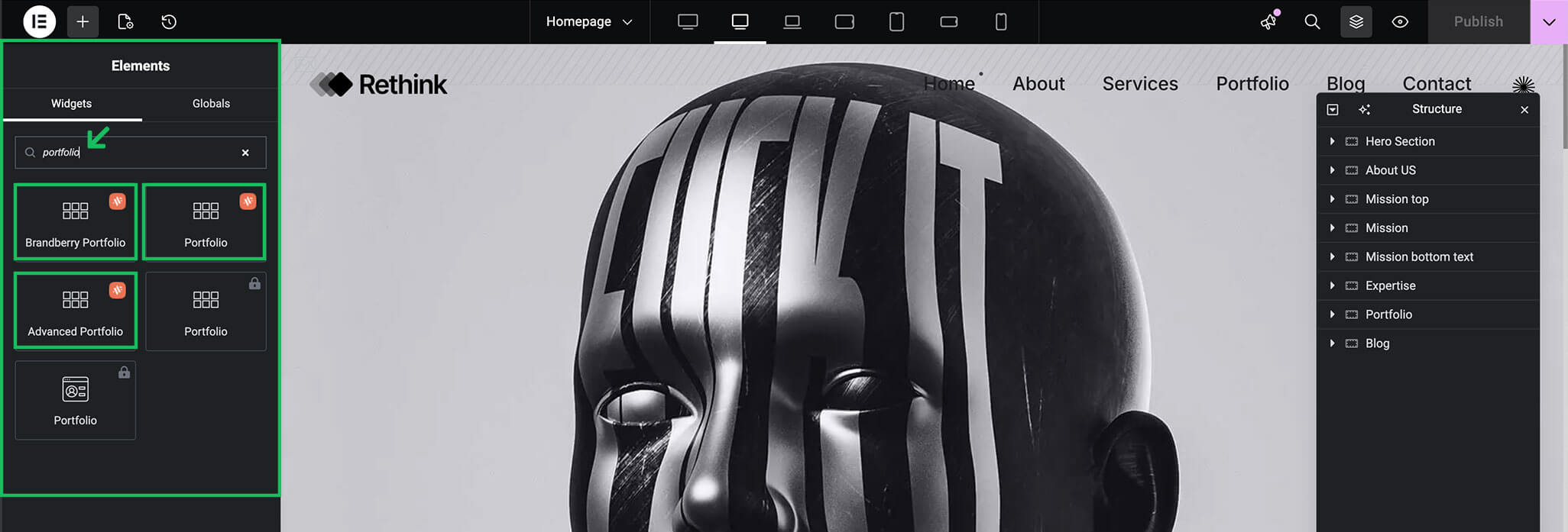 However, in some demos (for example, the Rethink demo) the portfolio layout is built directly using Elementor widgets, without relying on a custom post type.