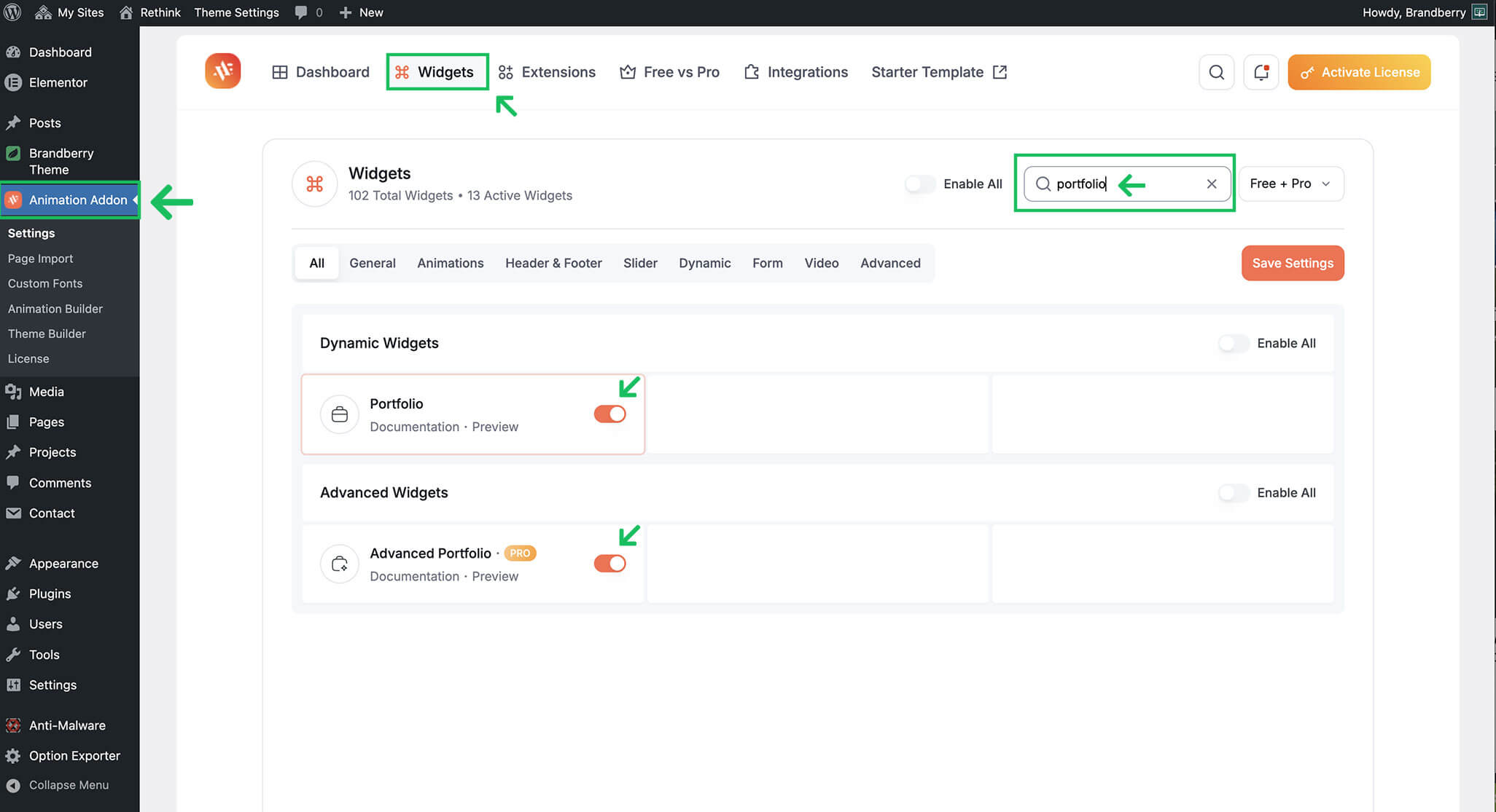 You are free to choose the approach that best fits your needs: structured projects using CPTs, or fully custom widget-based portfolios. Both methods are fully supported within Brandberry.