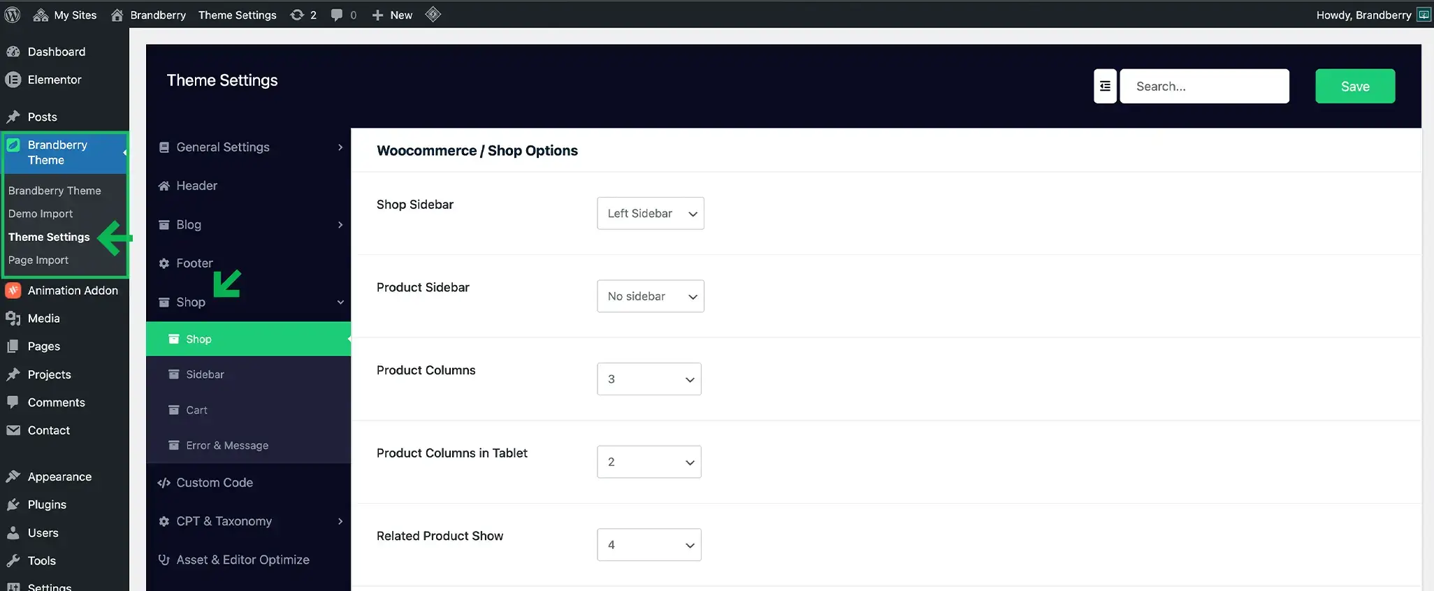 Brandberry includes dedicated WooCommerce theme settings that allow you to control your shop layout and styling without using Elementor.