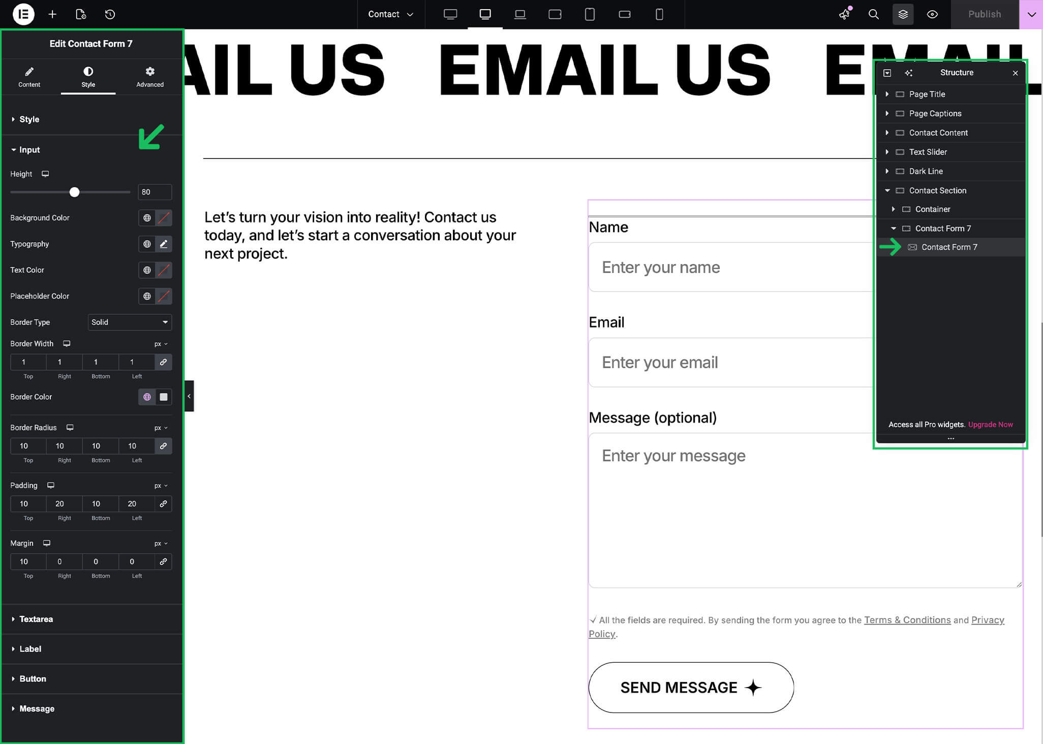 The Contact Form widget provides a wide range of styling controls, allowing you to customize the form appearance without writing CSS. You can style the following elements: