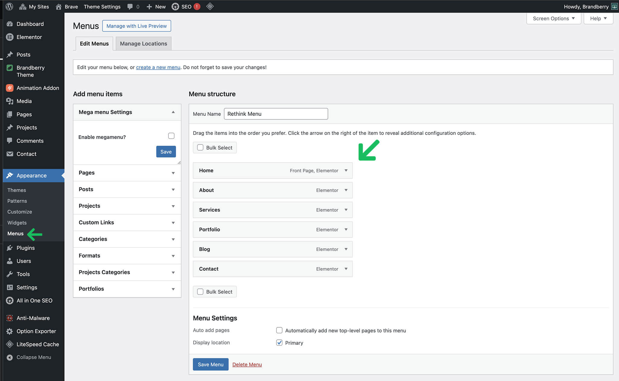 WordPress menus allow you to control your website navigation, including links to pages, custom links, categories, and custom post types. Brandberry fully supports the default WordPress menu system.