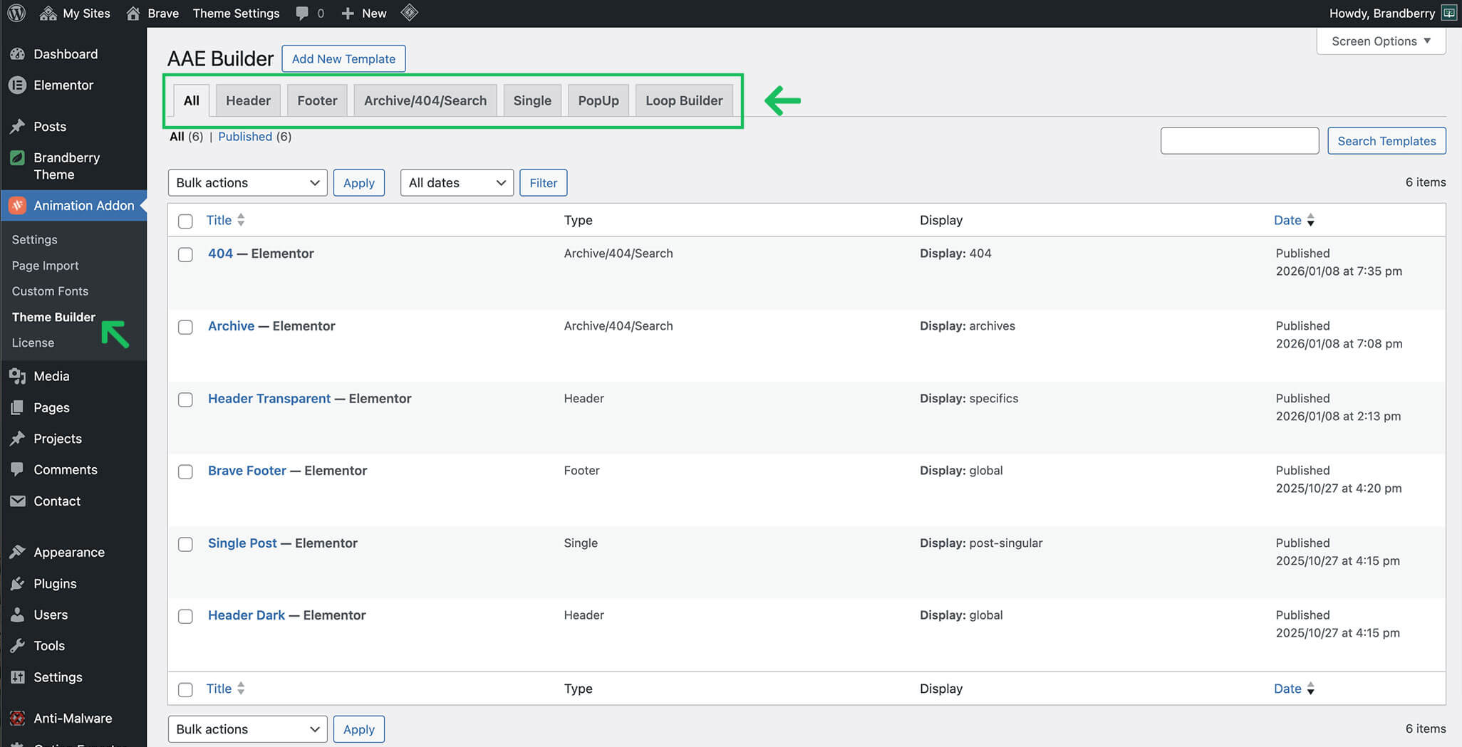Brandberry includes a powerful Theme Builder that allows you to create and manage headers, footers, and other theme templates visually using Elementor. This gives you full design freedom without editing theme files.