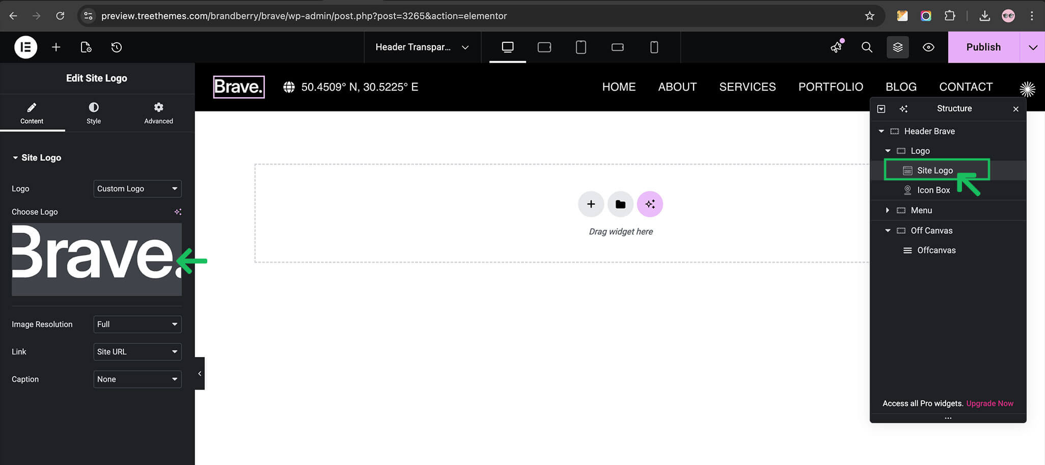 To display your website logo in the header, use the Site Logo widget inside the Elementor editor. The Site Logo widget allows you to: