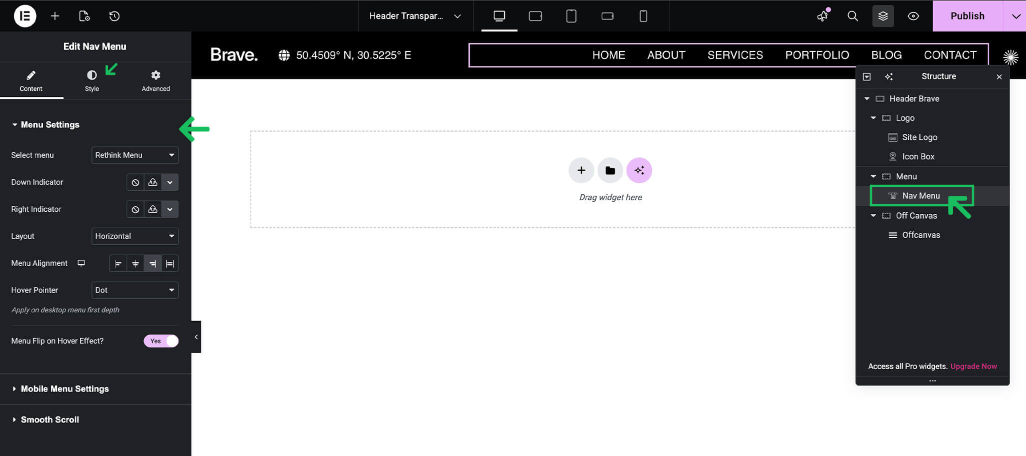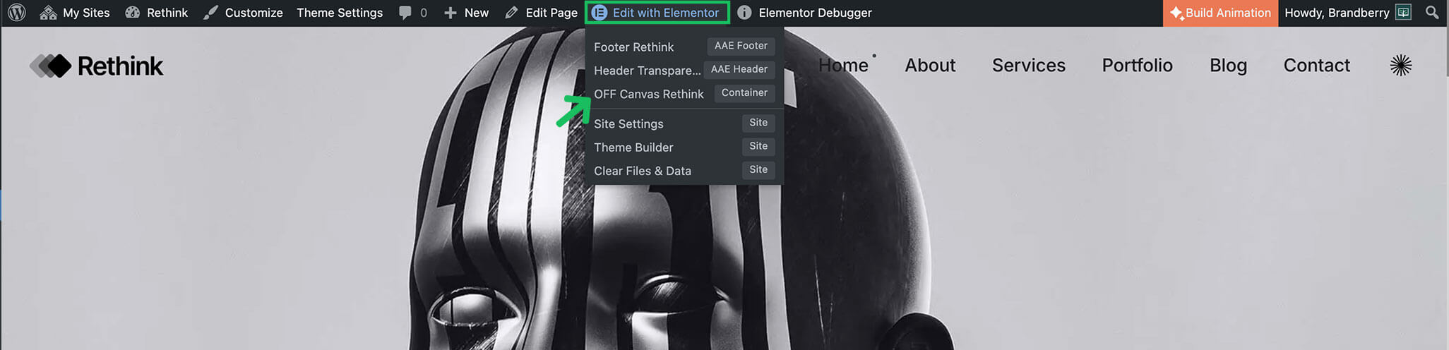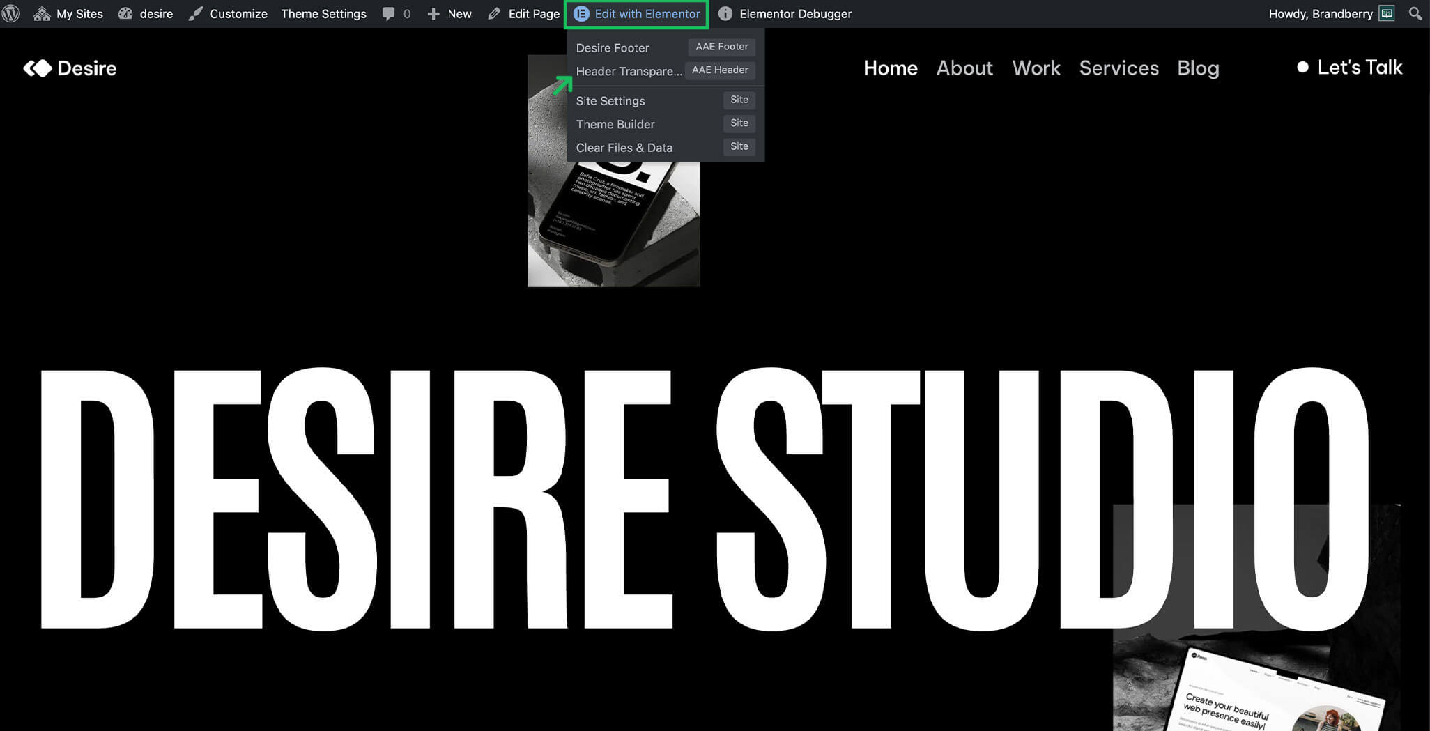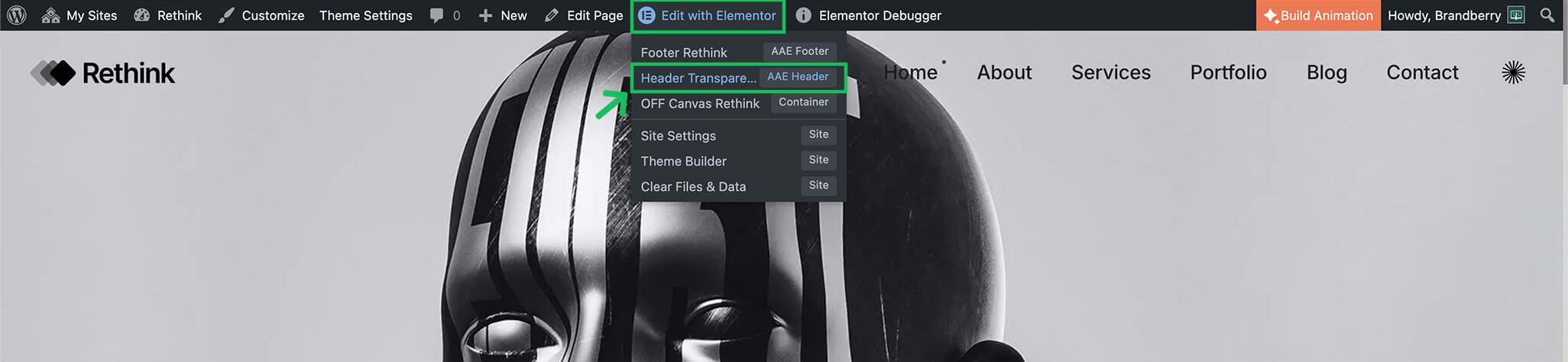 In Brandberry, headers are built visually using Elementor through the Theme Builder. This allows you to fully customize layout, spacing, colors, and responsive behavior without touching code.