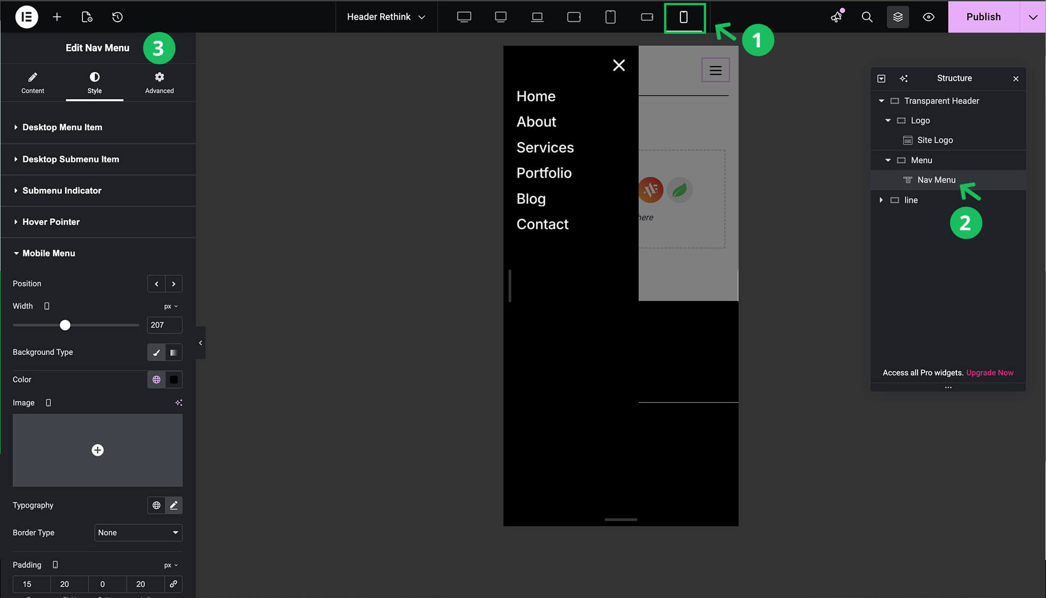 Using Responsive Controls. Elementor provides responsive editing options for desktop, tablet, and mobile devices. You can use these controls to customize how your header and menus appear on smaller screens.