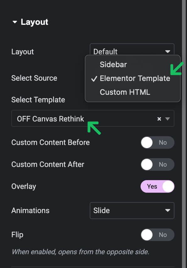 The content displayed inside the off-canvas panel is managed through a dedicated Off-Canvas template, built entirely with Elementor.