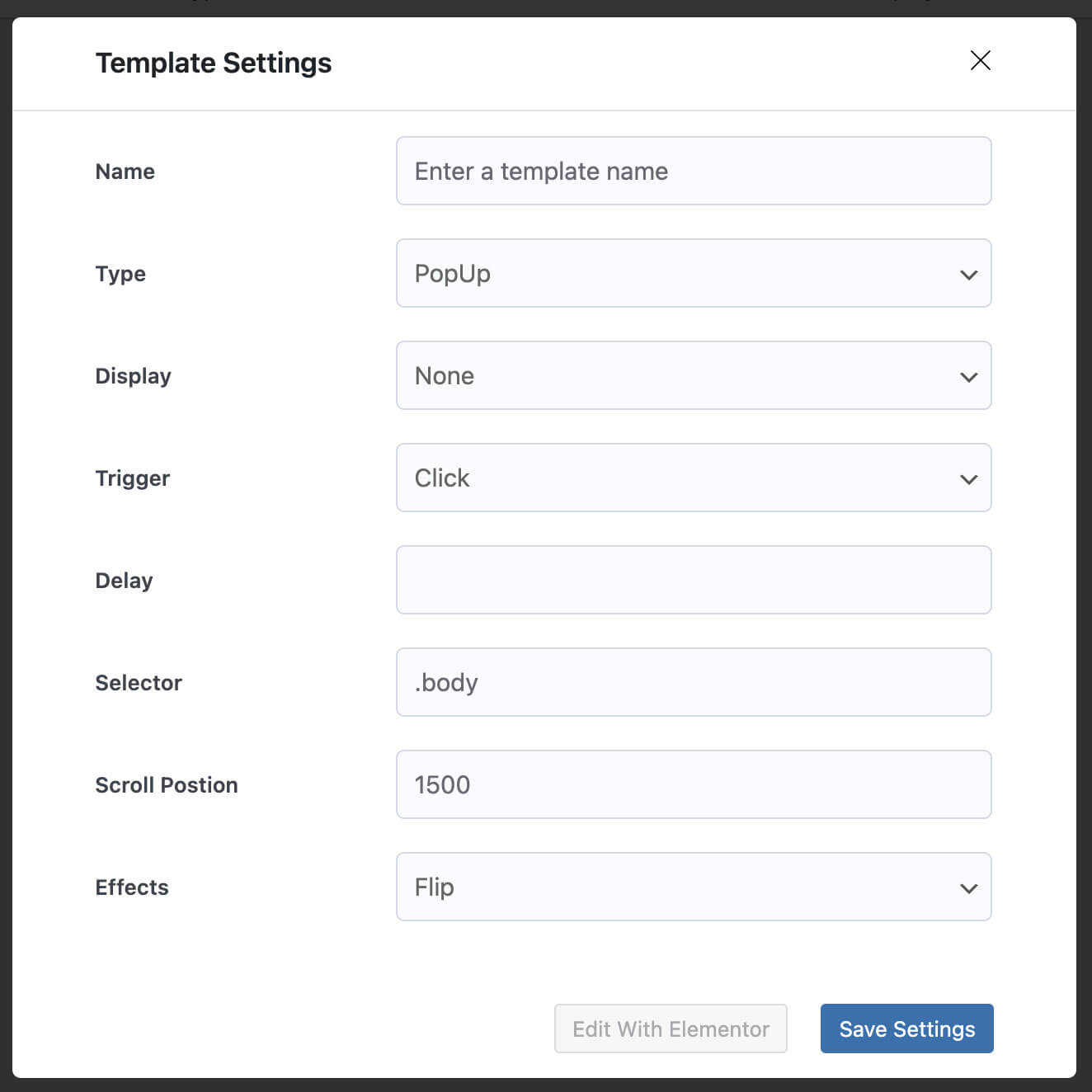 When creating or editing a popup, you will see a Template Settings panel. These settings control how and when your popup is displayed.