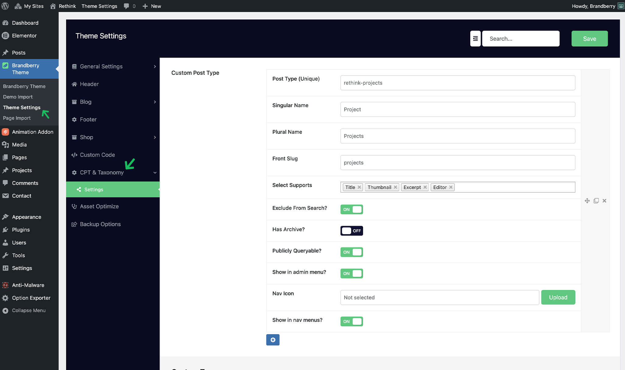 - Custom post types created using the CPT Builder (Theme Settings -> CPT)