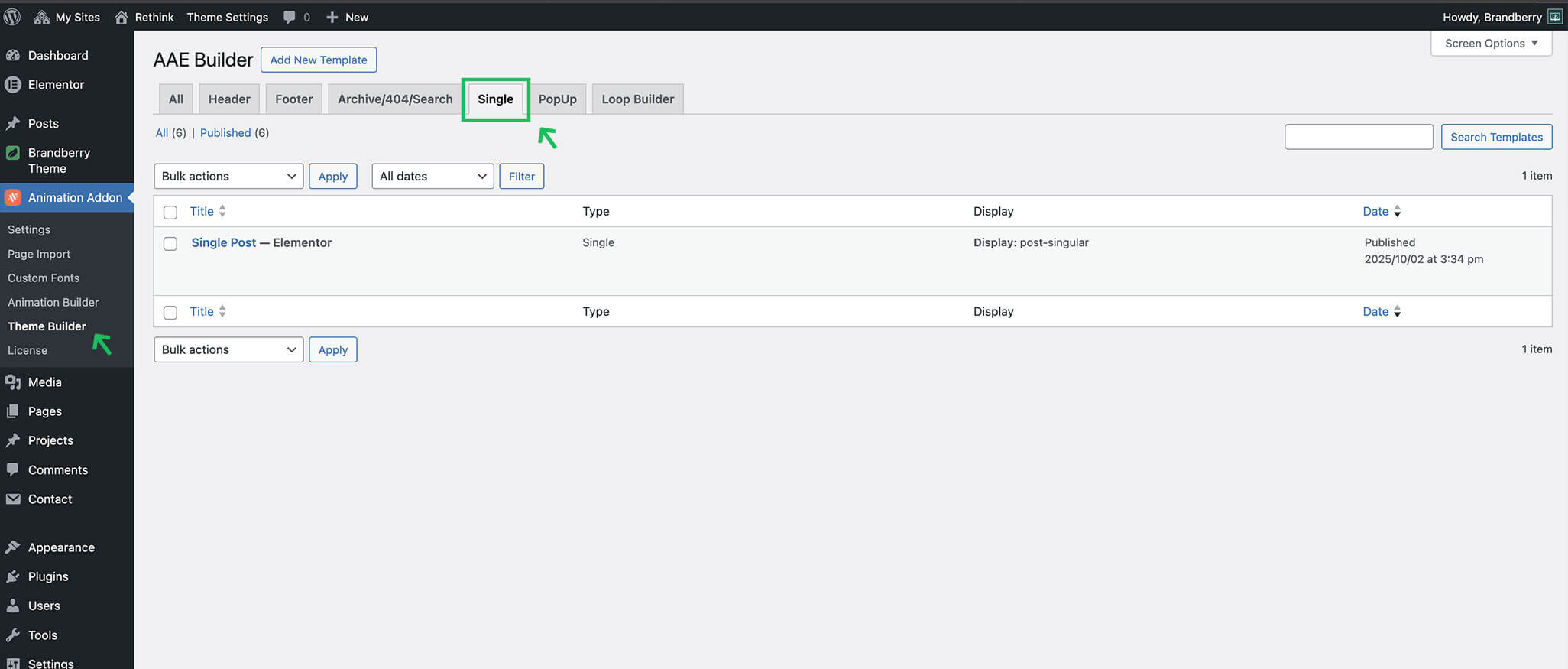 A single template defines the layout used when viewing one individual item, such as a blog post, a page, or a custom post type entry. With Brandberry, single templates are built using Elementor and can be applied to different content types through display conditions.