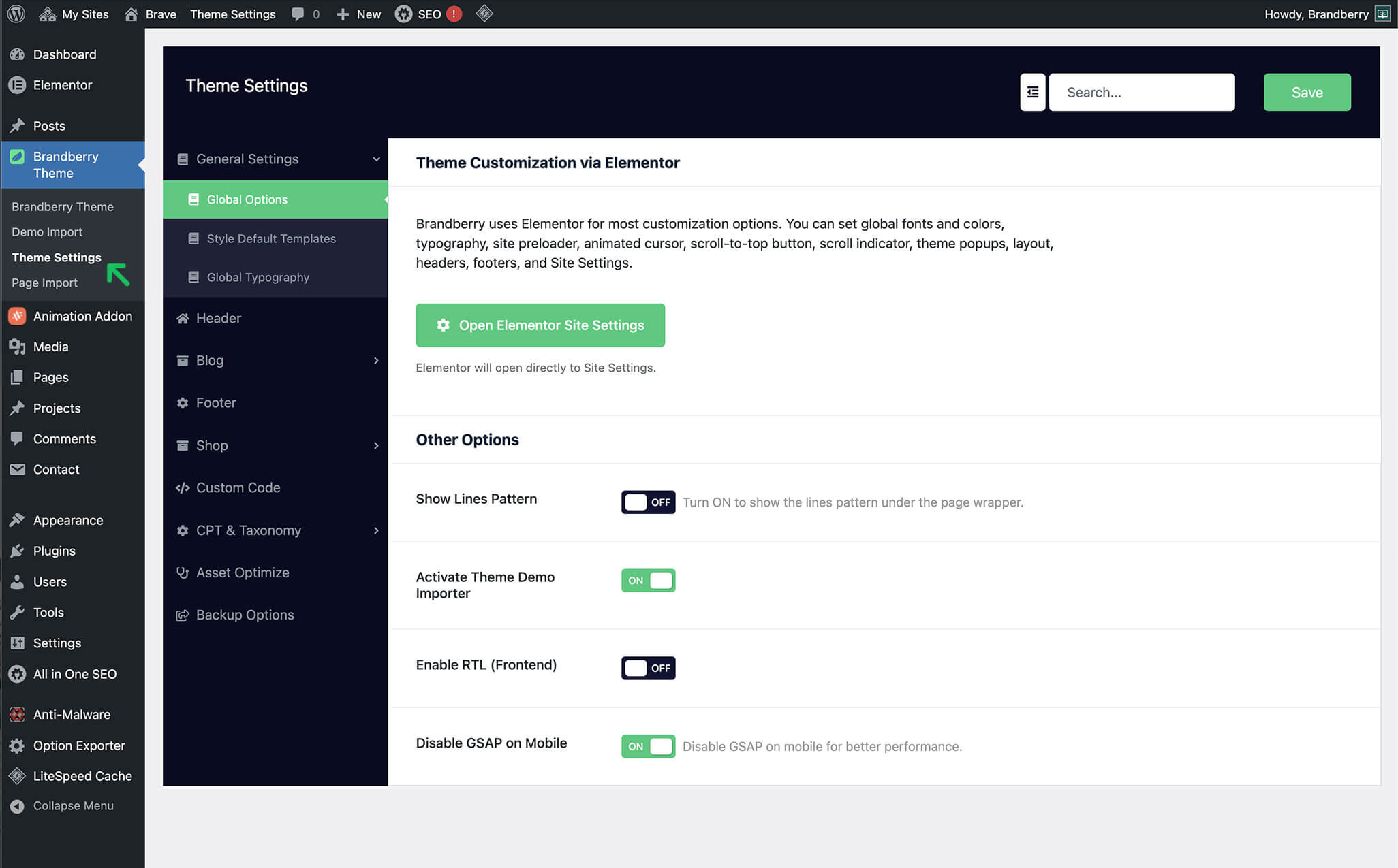 In addition to Elementor customization, Brandberry includes a dedicated Theme Settings panel for managing global behavior and advanced options. These settings control how the theme works rather than how it looks.