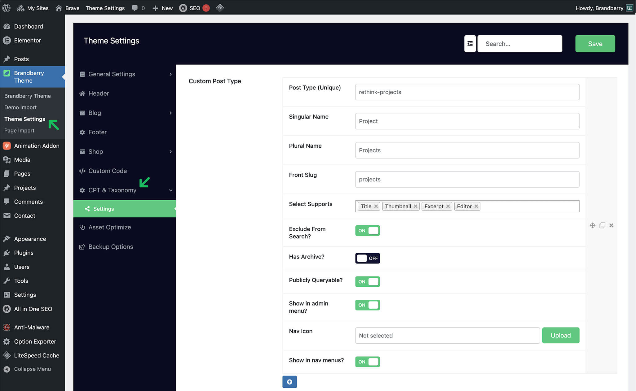Brandberry Theme → Theme Settings → CPT & Taxonomy → Settings