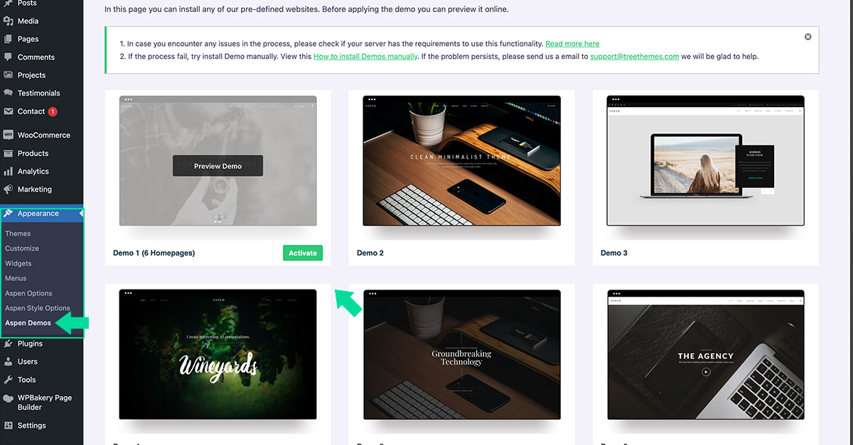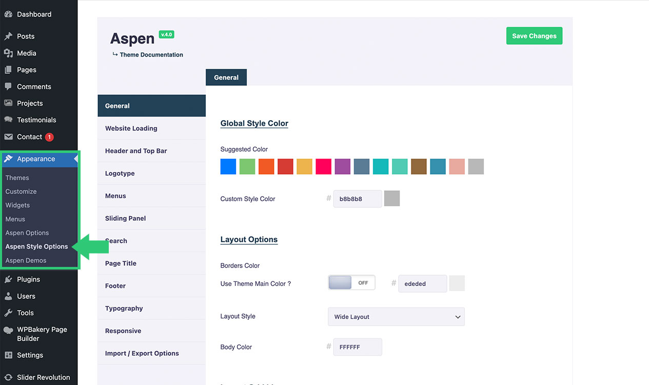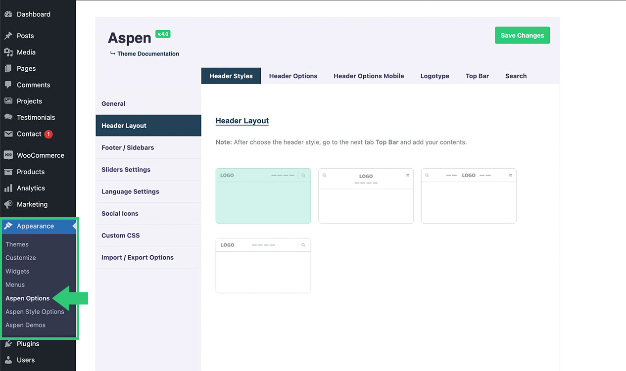 - Go to menu Appearance -> Aspen Options -> Save Changes (Green Button at the top right corner)