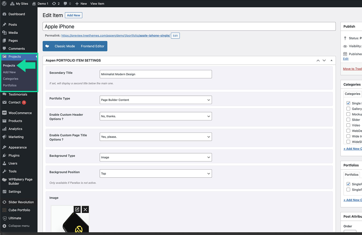 Now on the cube portfolio items, and depending of the type of project, Single Page, Single Page Inline or Simple link. Add the full project link in the field "Link"