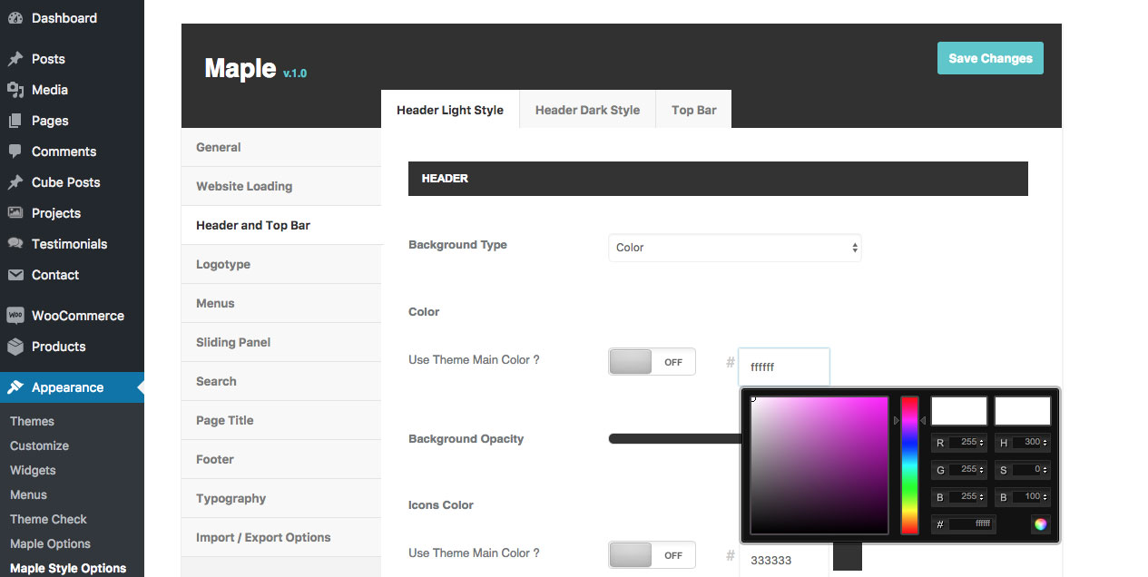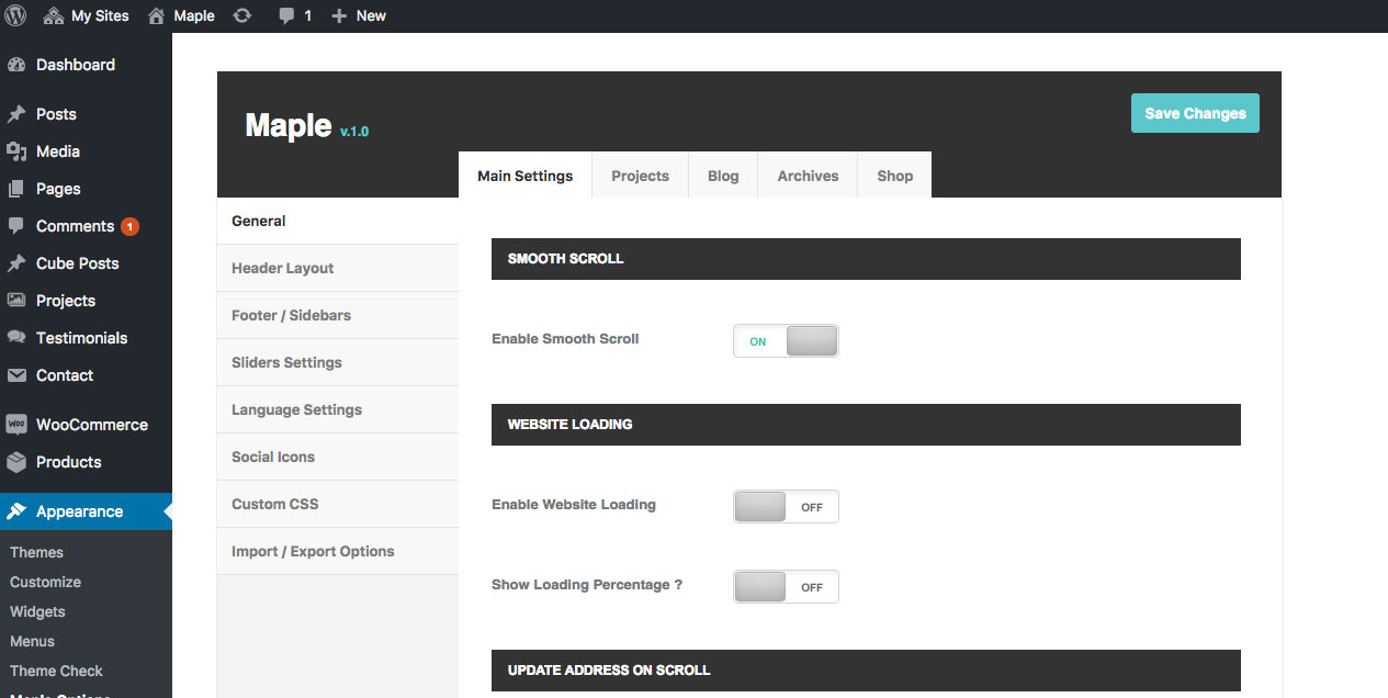 Maple comes with a very powerful options panel. After the theme is installed you can access the options panel by logging into the Wordpress dashboard and clicking Maple Options. Go to menu Appearance -> Maple Options and discover it!