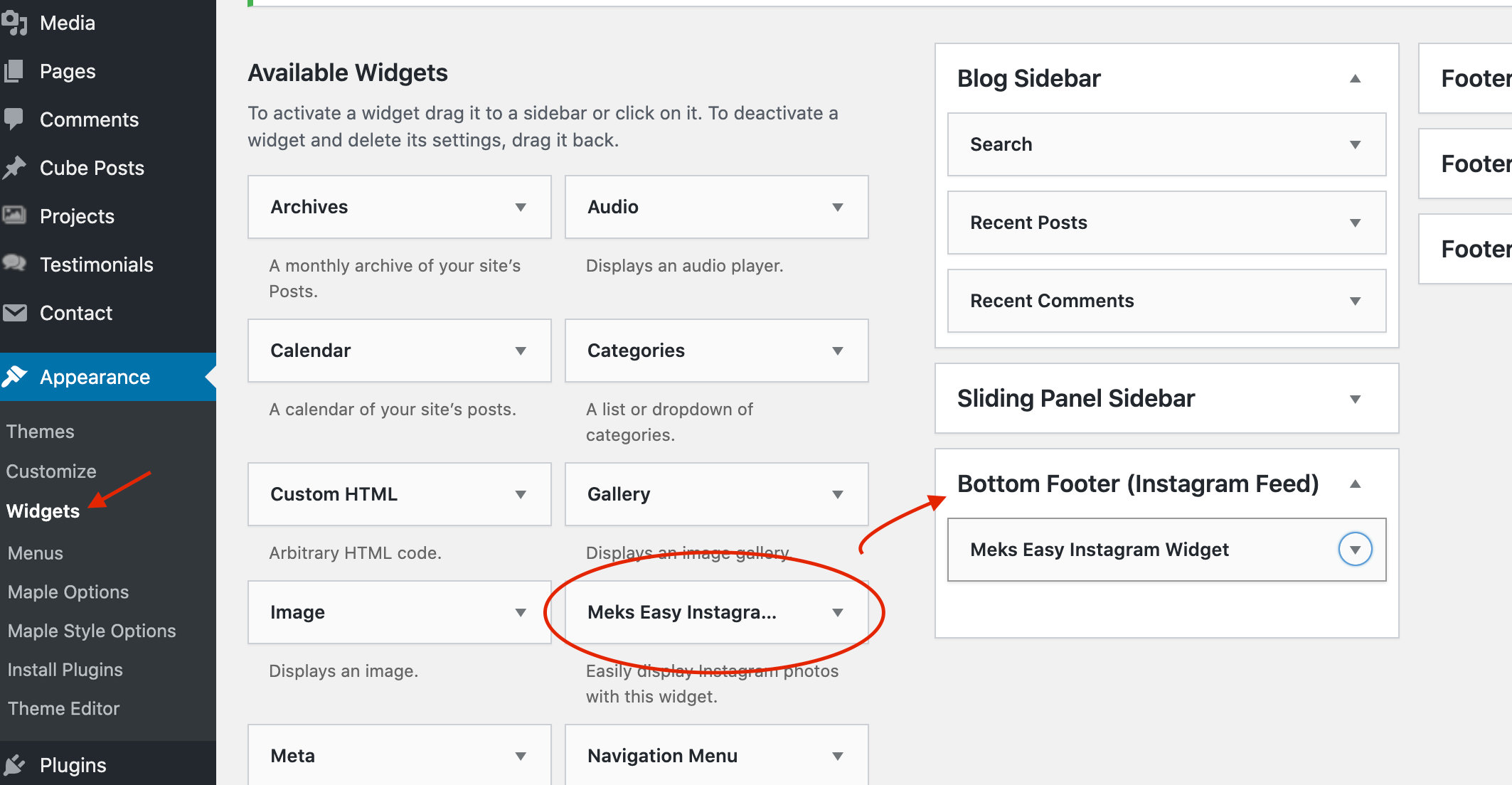 - Now just drag the Meks Easy Instagram Widget to the new sidebar