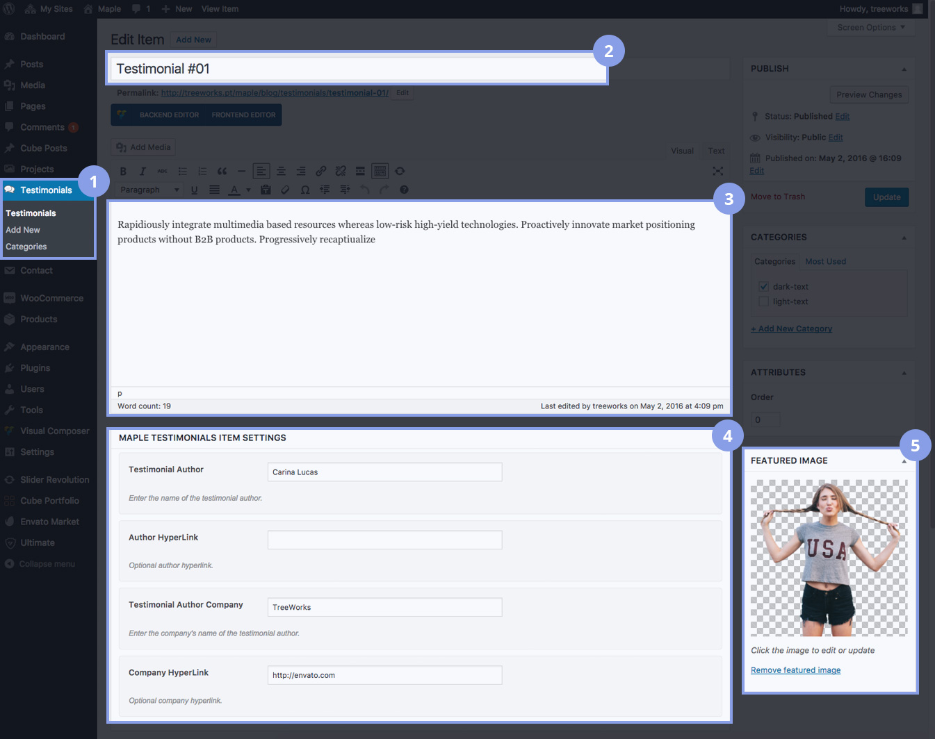 6. After you have all of this set up, just add your testimonial featured image, and then just save changes.