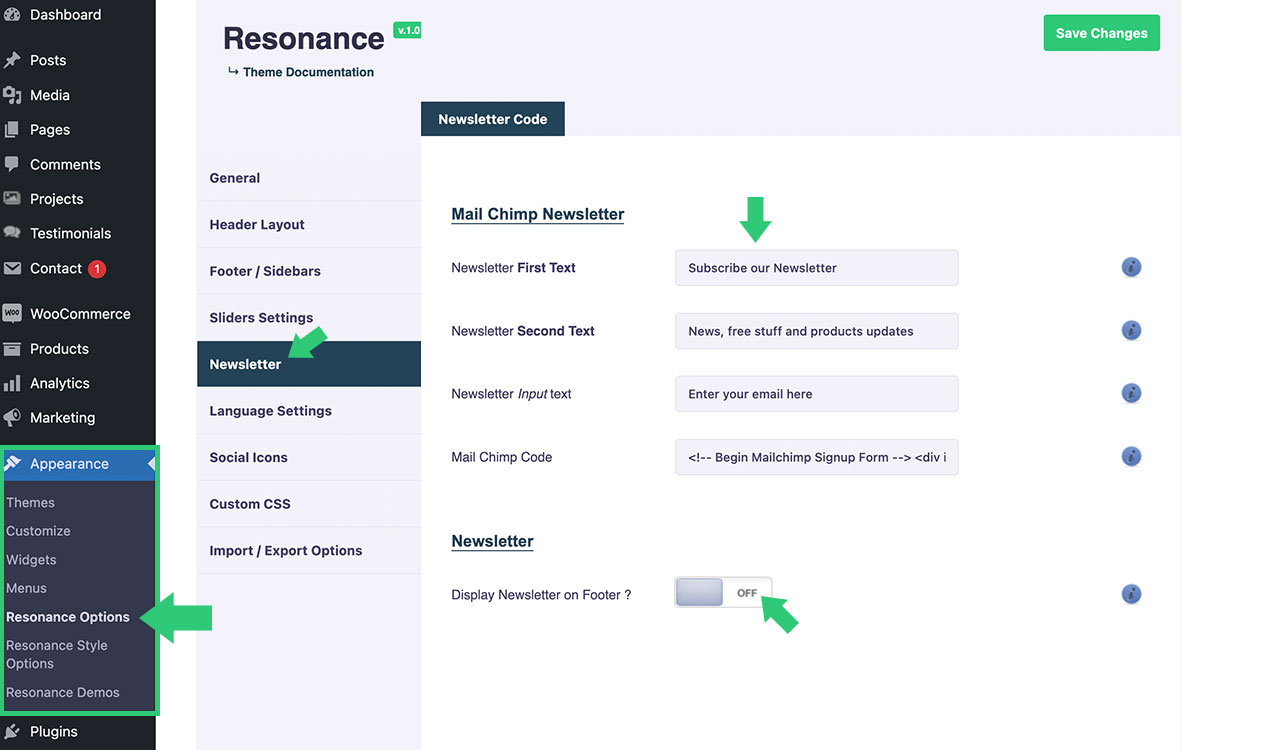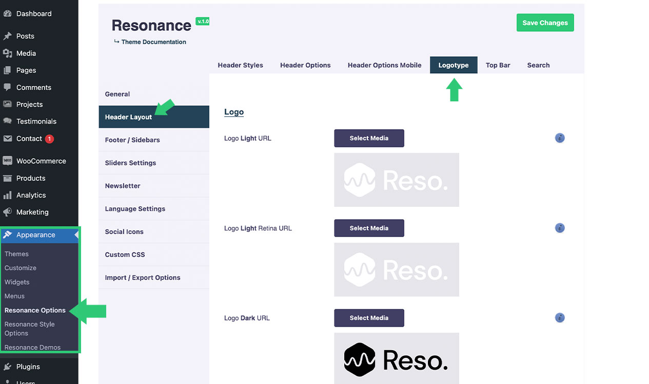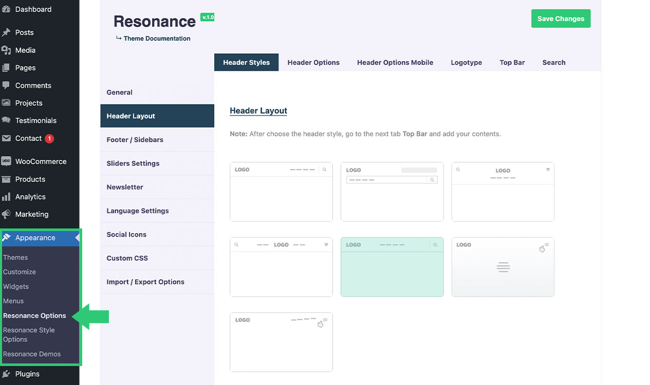 Resonance comes with a very powerful options panel. After the theme is installed you can access the options panel by logging into the Wordpress dashboard and clicking Resonance Options. Go to menu Appearance -> Resonance Options and discover it!