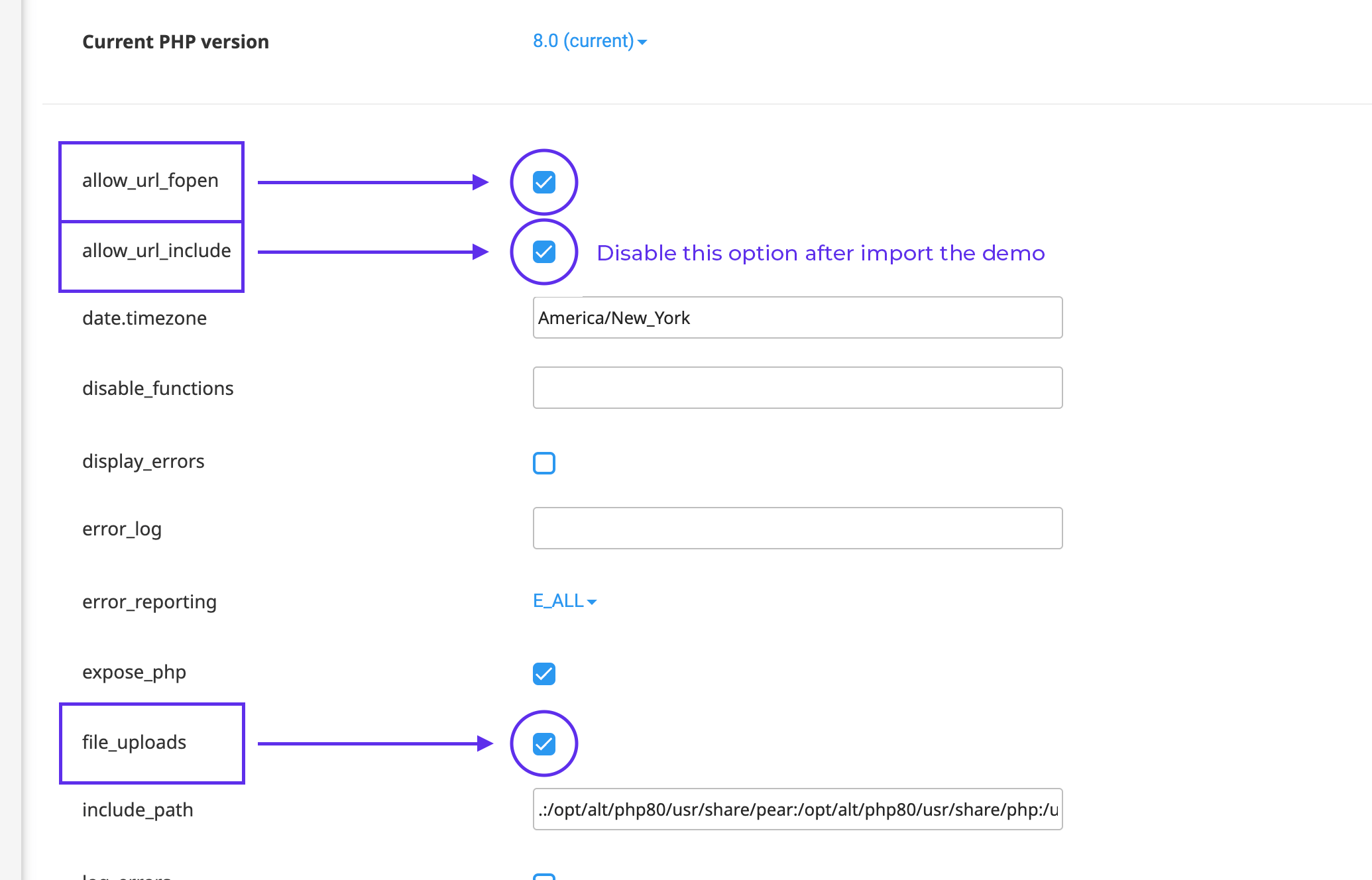 To import the demo via One Click your server need to have the following settings/extensions activated